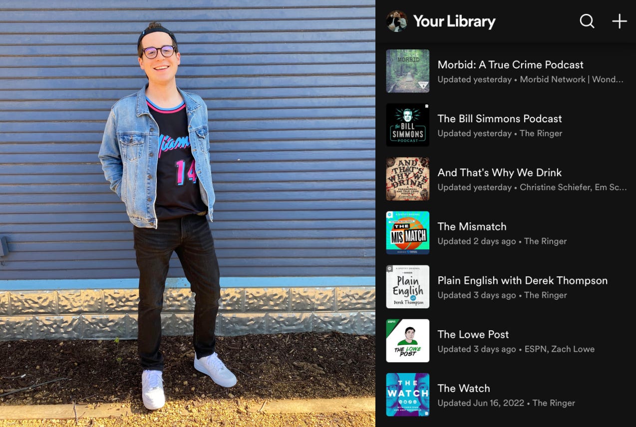 The app you use to listen: I currently use Spotify for my listening, mostly out of convenience. I used Stitcher for several years, but found that its design didnāt make up for the lack of simplicity in its UX, especially as my listening cue grew.