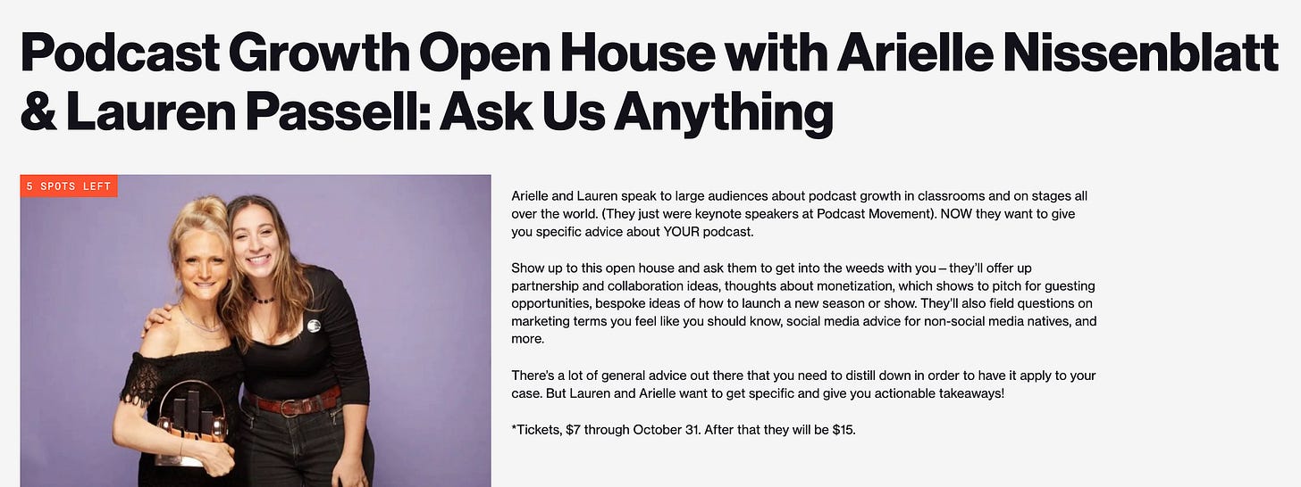 ✨Last I checked there were only 5 spots left for Ask Us Anything! On November 14 Arielle Nissenblatt and I are hosting an Open Podcast Growth session for Radio Boot Camp. We’ll give you specific tips for your show, tell you who to partner with, who to pitch,